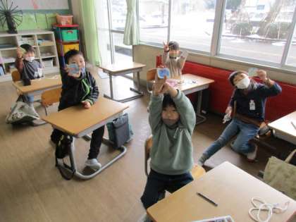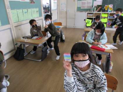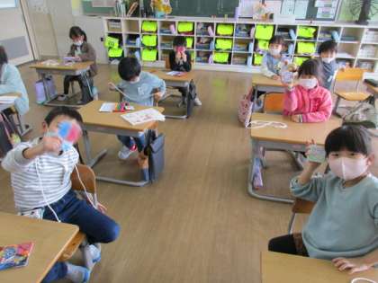 老人クラブの方々に伝承遊びを教えていただく「むかしのあそびをおそわるかい」に向けて、ぶんぶんごまに模様を描きました。回ったときの見え方を考えながら、きれいな色を塗っていました。当日、老人クラブの方々に穴開けと紐通しをしてもらい完成します。当日が楽しみです。