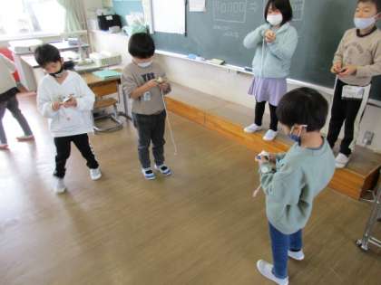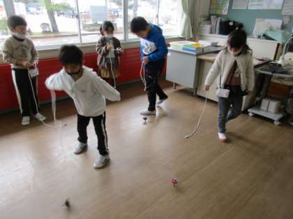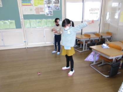 いよいよ明日、老人クラブの方々に昔の遊びを教えていただきます。今日は明日に向けて、こま回しに少し挑戦してみました。クラスのこま回し名人の友達にこつを聞きながら練習しました。
