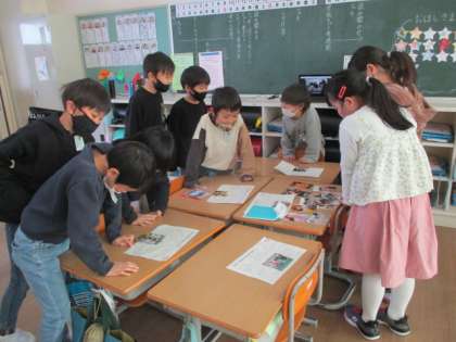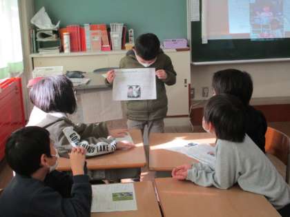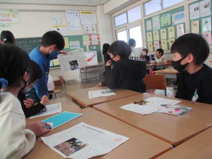 土日の宿題で保育園・幼稚園のころの自分についておうちの人にインタビューをしました。今日の生活科の授業ではグループごとで発表をしました。発表後は、自由に友達のプリントを見ました。