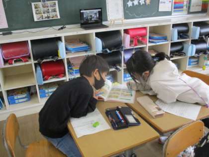 国語「おにごっご」の文章を読んで大事な言葉を確認しました。今日の学習では、他の遊びについて書かれた本を読んで大事なことをメモしました。