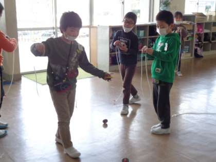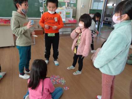 【1年生】昔の遊び 公開日 2022/02/01 更新日 2022/02/01 1年生 今日はめんこやお手玉にも挑戦しました。また、初めて「ぶんぶんごま」「こま」ができた子もおり、笑顔が輝いていました。あきらめずがんばったからですね!