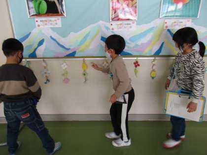 大きい数にも慣れてきた子供たち。今日は、算数の時間に、学校にある物の数を数える大きな数のビンゴゲームをしました。うまくビンゴになるように、見当を付けていろいろな物を数えていました。友達と協力し、仲良く活動できました。