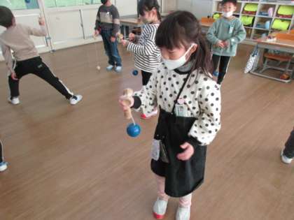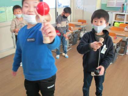 【1年生】昔の遊び 公開日 2022/02/07 更新日 2022/02/07 1年生 今日は、けん玉に挑戦しました。あまり経験のない子達も、何度もチャレンジするうちに成功し「初めて乗った!!」と喜んでいました。