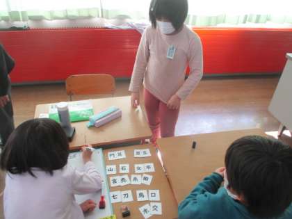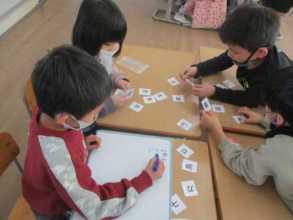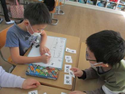 国語で、「カンジーはかせのだいはつめい」で、漢字を合体させてほかの漢字を作ろうという学習を行いました。カードを使って楽しく漢字作りゲームをしました。
