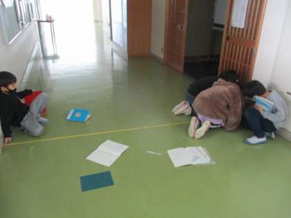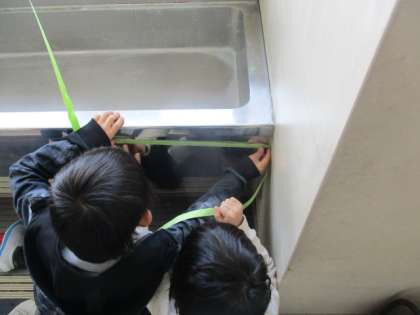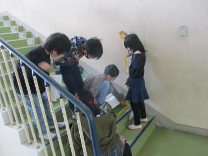 算数の学習で、昨日作成した3メートルテープを使って長さ調査探検に行きました。学校の色々なモノの長さをグループの友達と協力して測りました。