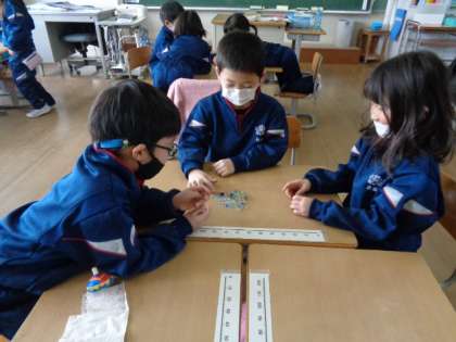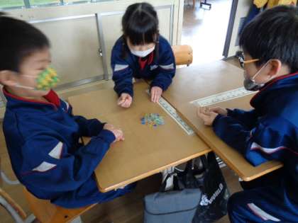 今日はみんなでおはじきで遊びました。将棋崩しのように他のこまを崩さずに一つずつ取っていきます。真剣にがんばっていました。