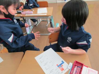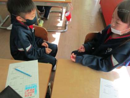 算数の「どちらがひろい」の学習でじんとりあそびをしました。じゃんけんをすると1ます塗ることができ、塗ったますが多い方が勝ちというゲームです。週末に、お家の人と一緒に遊べるようワークシートを持ち帰りますので、ぜひお子さんと楽しんでみてください。