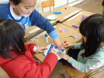 グループのみんなで、廊下の掲示板に飾る「おめでとう」の掲示作りをしました。すてきなできばえに子供たちは大満足です。6年生さんへの感謝の気持ちを込めた活動はこれからも続きます。