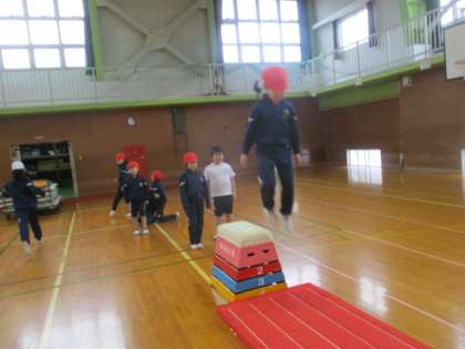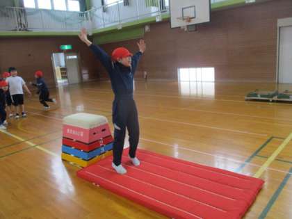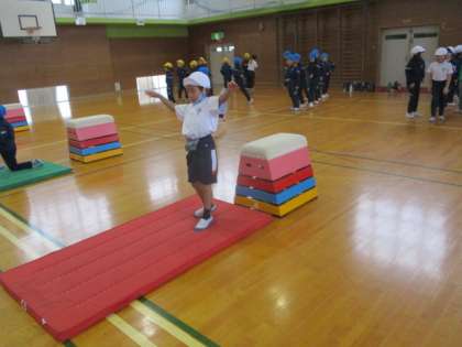 体育の学習で跳び箱がスタートしました。今日は、基礎になる手の付き方「着手」と着地の仕方を学習しました。