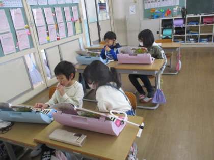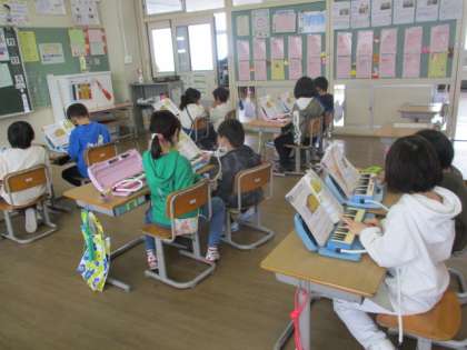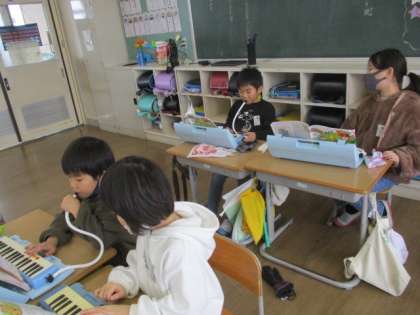 鍵盤ハーモニカで「こぐまの2月」を指遣いに気をつけて演奏しています。今日はお友達とお互いにチェックしながら練習をしました。