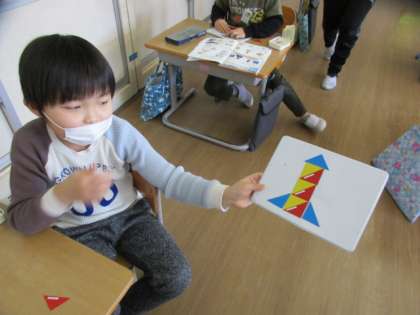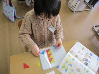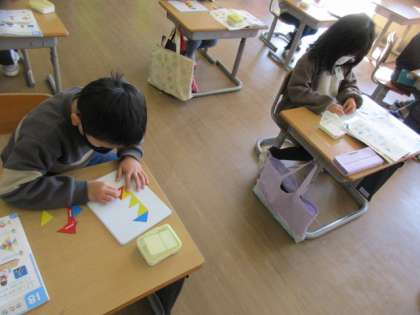 算数「かたちづくり」の学習で、三角形の色板を使っていろいろな形を作りました。「○○ができた!」と楽しそうな子供たちでした。