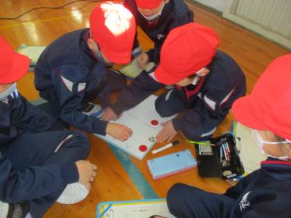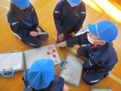 体育で「ボールけりゲーム」に取り組んでいます。チームごとに、ホワイトボードを使用して、作戦を練っています。
