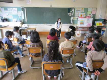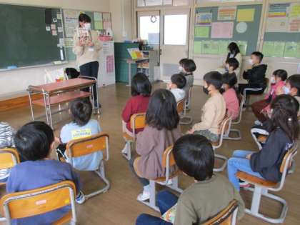 「かたあしのひよこ」というお話を本や絵を見ずに耳だけで聞く「素話」で楽しみました。みんな、想像を膨らませながら一生懸命聞いていました。