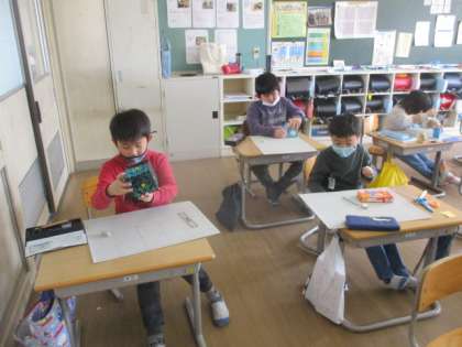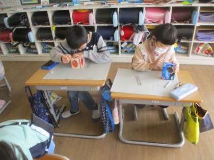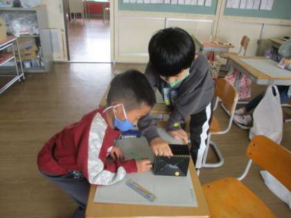 算数では「はこの形をしらべよう」という学習をしています。持参したはこの面をペアになって厚紙にうつしとっています。