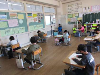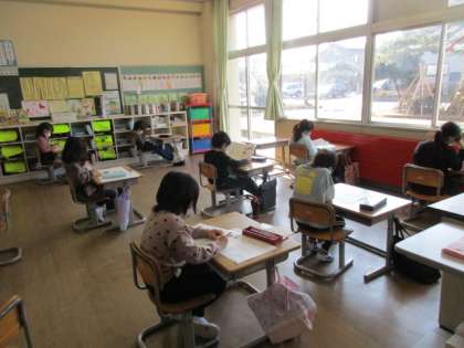 【1年生】期末テスト 公開日 2022/03/09 更新日 2022/03/09 1年生 国語・算数の期末テストを行いました。子供たちは、今までの学習で身に付けたことを100%発揮できるよう、集中して取り組んでいました。