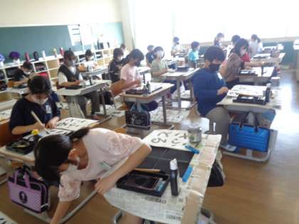 5年生になって初めて書写の学習をしました。筆の運びを意識して「ふるさと」という字を練習し清書を提出しました。