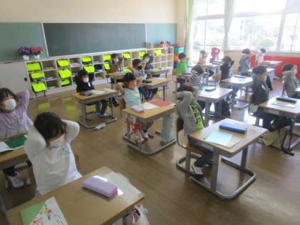 【1年生】初めての書写 公開日 2022/04/12 更新日 2022/04/12 1年生 1年生の最初の書写の学習でした。写真は書写体操の様子です。姿勢や鉛筆の持ち方に気を付けて、自分の名前を丁寧に書きました。