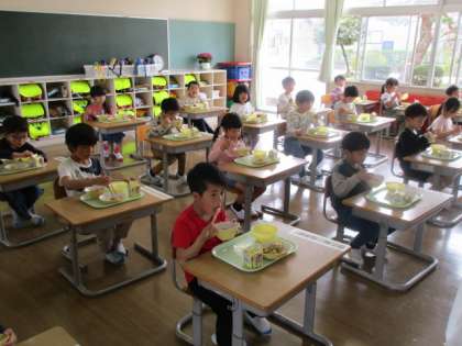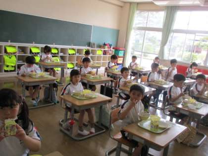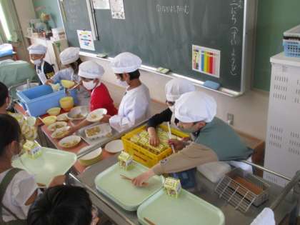 今日で給食も3日目になりました。給食当番の子供たちは、少しずつ自分の仕事に慣れ、上手に盛り付けたり、配ったりすることができるようになってきました。食べ終えて、「昨日よりもたくさん食べれたよ」「野菜おいしかったよ」とうれしそうに話す子供たちの姿も見られました。