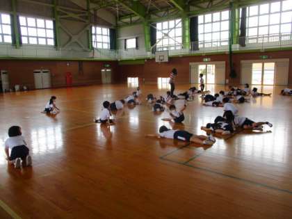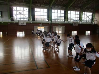 体育の授業で様々な体ほぐし運動をおこなった2年生。「いろいろウォーキング」という運動ではリズムに合わせて元気いっぱいに歩く様子が見られました。