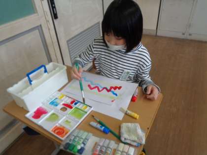 図画工作科では、水の量を変えたり、絵の具を混ぜてどんな色になるのかを試したりしました。また、太い線や細い線、波線等、様々な線を組み合わせて描きました。楽しみながらつくりあげた作品はTシャツ型に切り取り、オリジナルのカラフルTシャツにします。完成が楽しみですね。