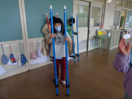 2年生ワークスペースには竹馬があります。休み時間に竹馬に挑戦する2年生が増えてきました。初めてする子が多いのに、すぐに乗れるようになっていて驚きました。