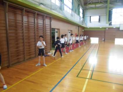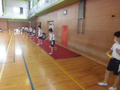 今日の体育では、バトンを使ってリレーの練習をしました。前を向いてバトンを受けとることを意識している子供たちが増えています。上達している子供たちです。