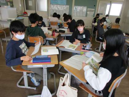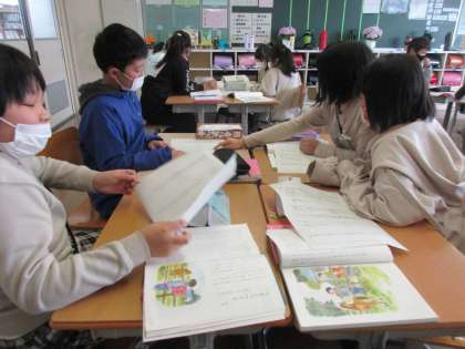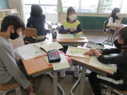 「なまえつけてよ」の学習で、登場人物2人の発言や行動から気持ちを読み取っています。一人一人で考えた後、グループで交流し、考えを深めていました。