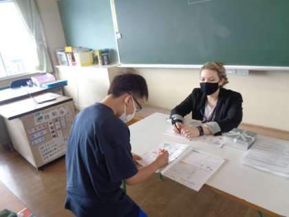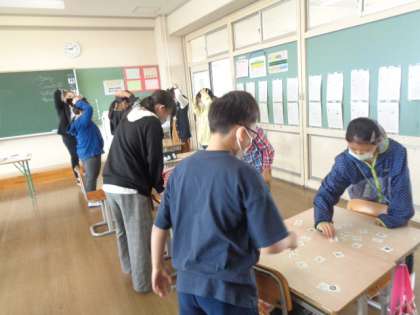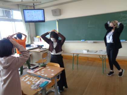 ALTの先生と一緒に外国語を学習しています。今日は、歌を歌ったり、チャンツをしたり、アルファベットカルタをしました。楽しみながら学習に取り組んでいます。