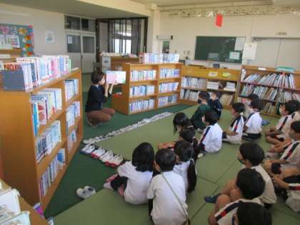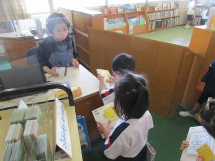 司書の先生と、図書室の使い方について学習しました。図書室の中を歩きながら、様々な種類の本に興味津々の子供たち。カウンターでの本の貸し出しも上手にできました。