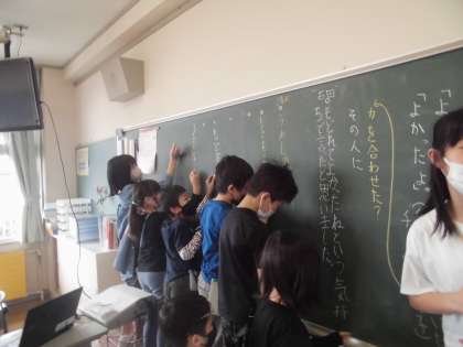 【4年生】白いぼうし 公開日 2022/04/21 更新日 2022/04/21 4年生 国語の時間では、登場人物の気持ちについて考えました。たくさんの子供たちが、意見を黒板に書いていました。友達の意見を聴くことで考えが深まることに気づいた子供たちでした。子供たちのよいところがたくさん見られました。