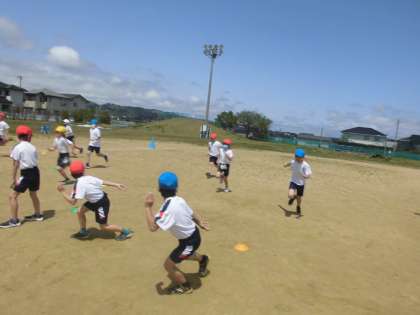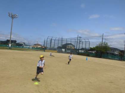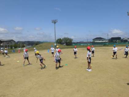 グラウンドでリレーの練習をしています。グラウンドでのリレーの練習は初めてでしたが、思いっきり走ってバトンを受け渡していました。