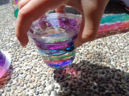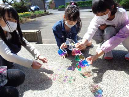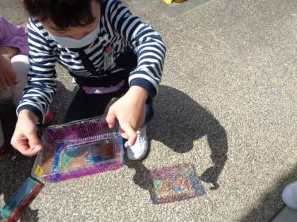 図工で「光のプレゼント」の作品を作りましたが、あいにくの雨の日でした。今日はお日様が出ていたので、早速子供たちは自分の作品を陽の光で地面に映し、「キレーイ!」と大喜びでした。ちょっとした廃材が、宝石のように美しく変身するなんて、工作って楽しいですね。