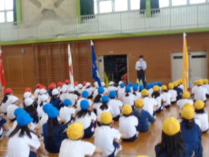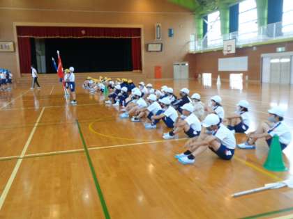 あいにくの天気で体育館での練習になりましたが、運動会に向けて一生懸命練習に励んでいます。待つときの姿勢や声の張りなど競技以外にも気を配っています。