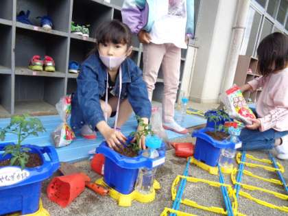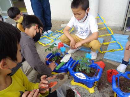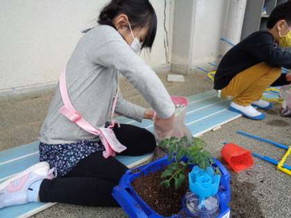 今日はミニトマトの苗植えをしました。「根っこをしっかり隠してあげてね」と声を掛けたところ、どの子も丁寧に一生懸命苗を植えていました。どの子もしっかりと根付いてくれたらいいなあと願っています。