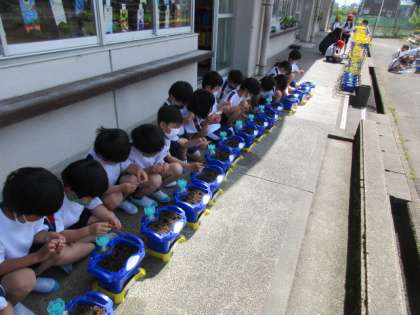【1年生】あさがおの種植え 公開日 2022/05/10 更新日 2022/05/10 1年生 生活科で、あさがおの種を植えました。種を観察した子供たちは、「スイカみたいな形だね」「元気に育って欲しいな」と楽しみにしていました。一つ一つの種を、大事そうに植える子供たちでした。