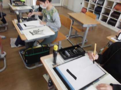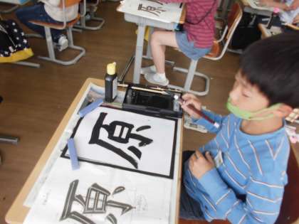 今日は、「原」の2回目をしました。はらいや中心に書くことに気を付けて書いていました。真剣な表情で筆を運んでいました。
