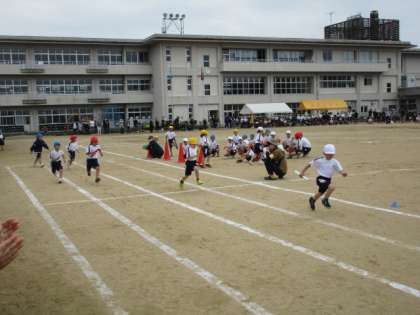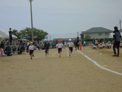 リレーでは、一生懸命走る友達を大きな声援で元気づけました。選手のダイナミックな走りも見事でした!団のみんなで、力一杯喜んだり、拍手を送りました。