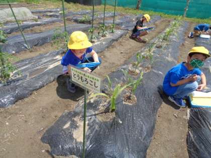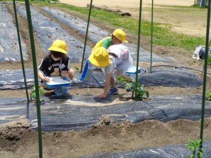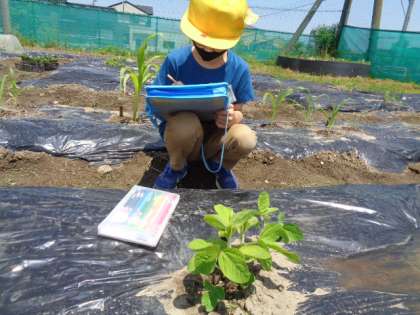 苗植えから2週間経ちました。ミニトマトもマイ野菜も、すくすくと生長しています。前と比べての違いを見付けながら観察日記を書きました。