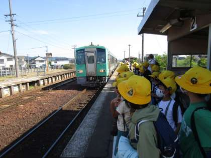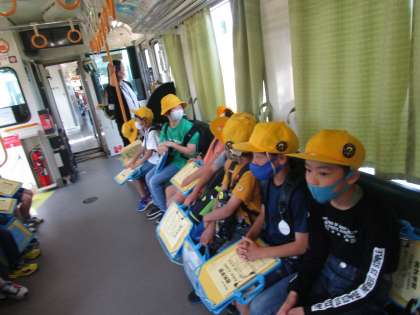 千里駅から電車に乗っているところです。みんな電車にわくわくしていました。
