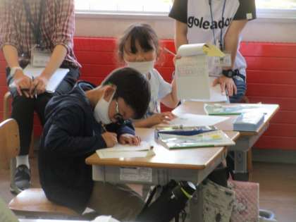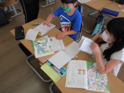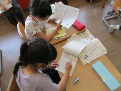 ペアの友達と迷子捜しゲームをしました。一人が読んで、一人がメモして捜します。大事なことを落とさずに話したり、聞いたりする力を鍛えています。