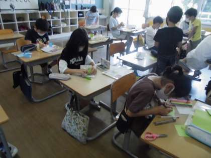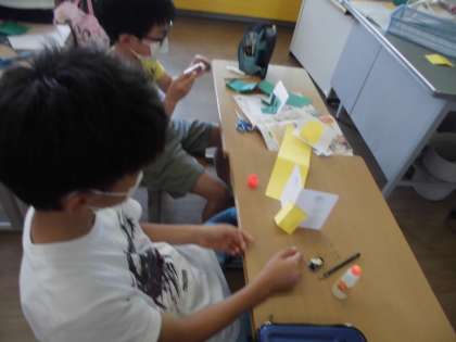 【4年生】図工 カードで伝える気持ち 公開日 2022/05/25 更新日 2022/05/25 4年生 図工では、飛び出すカードを作るために、仕掛けを自分で作る練習をしています。立ち上がる仕掛けを作りました。仕掛けから思い付くことを表現していました。