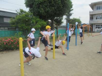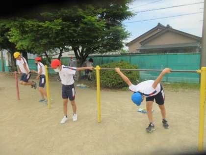 体育の学習では、鉄棒運動に取り組んでいます。 できる技の数を増やそうと、友達と教え合いながら練習しています。