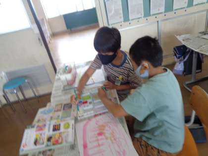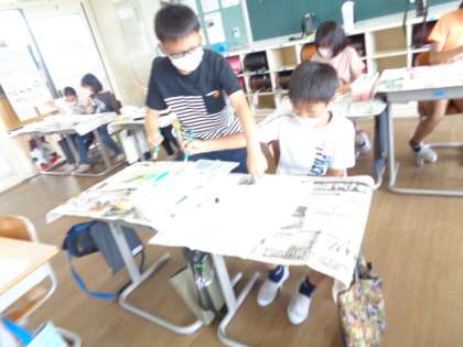 【5年生】心のもよう 公開日 2022/06/01 更新日 2022/06/01 5年生 図工の学習で、色々な技法に挑戦して絵を描きました。子どもたちは、筆をふったり、毛先をはじいたり、水を紙に置いてから色をつけたりして思い思いに描いていました。