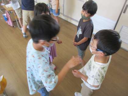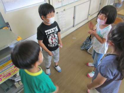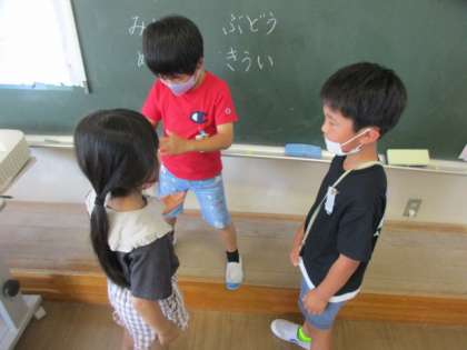 音楽「はくをかんじとろう」の学習で、フルーツランドゲームをしました。くだものの名前を言いながら「たんたんたん」のリズムに合わせて手を叩きました。友達と順番に言い合い、楽しく活動しました。