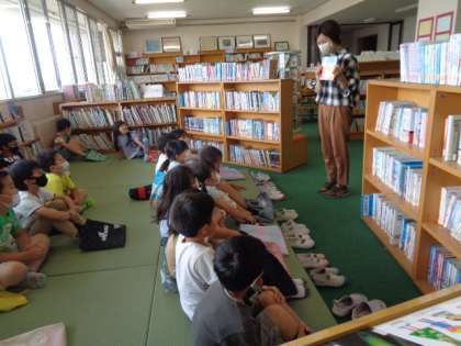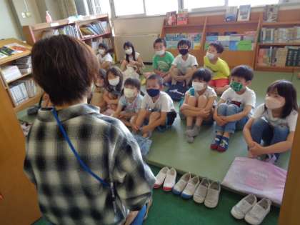 今日は、「でっこりぼっこり」を読んでいただきました。子供たちは絵本に出てくる巨人に興味しんしんの様子でお話を楽しんでいました。司書の先生から、靴をきちんと並べたり、静かに聞く姿勢で待てたりする様子を褒めていただき、子供たちはとても嬉しそうでした。