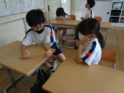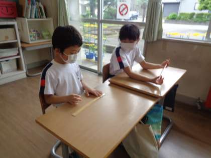 算数では長さの勉強に入りました。竹ものさしは、数字が書いていないため、自分で目もりを読み取ることが必要です。ペアで問題を出し合ったりして、少しずつ慣れてきたようです。ミリメートルが難しいですね。