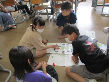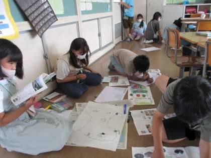 社会科の学習で、富山県の産業を白地図にまとめた「富山県産業マップ」を作成しました。グループに1枚ずつ富山県の白地図を配り、「きょう土のすがた」の冊子を見ながら、県内の産業を地図に書き込んでいきました。どのグループも真剣に取り組み、立派な産業マップが完成しました。活動を通して、県内の主な産業について理解を深めました。