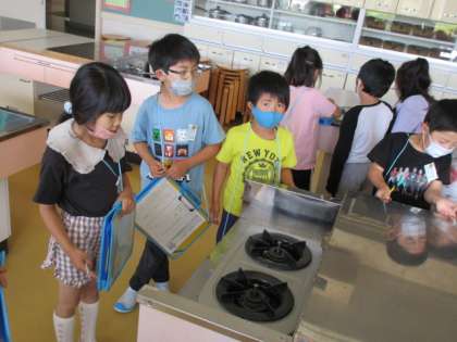 【1年生】がっこうたんけん(1階) 公開日 2022/06/09 更新日 2022/06/09 1年生 家庭科室の探検をしました。調理道具や洗濯機等を見付け、興味津々の子供たち。「家にもあるよ」「黒板が図工室と同じだ」と、たくさんの発見をしたようです。