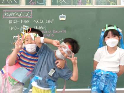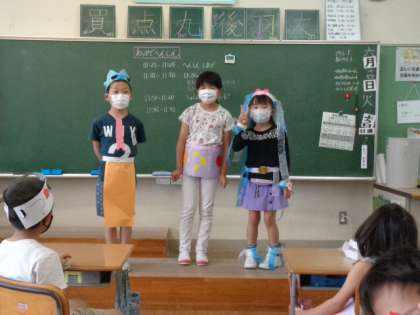 図工「わっかで変身」もいよいよ今日がラストでした。子供たちは頭や腰、手や足にたくさんのわっかをつけて楽しく変身しました。この学習を通してホチキスの扱いに随分慣れ、使いこなせるようになりました。