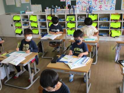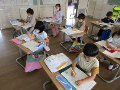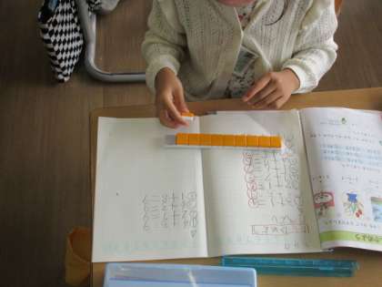 たし算の学習では、答えが9になる式を考えました。ブロックを使いながらいろいろな式を考えることができました。